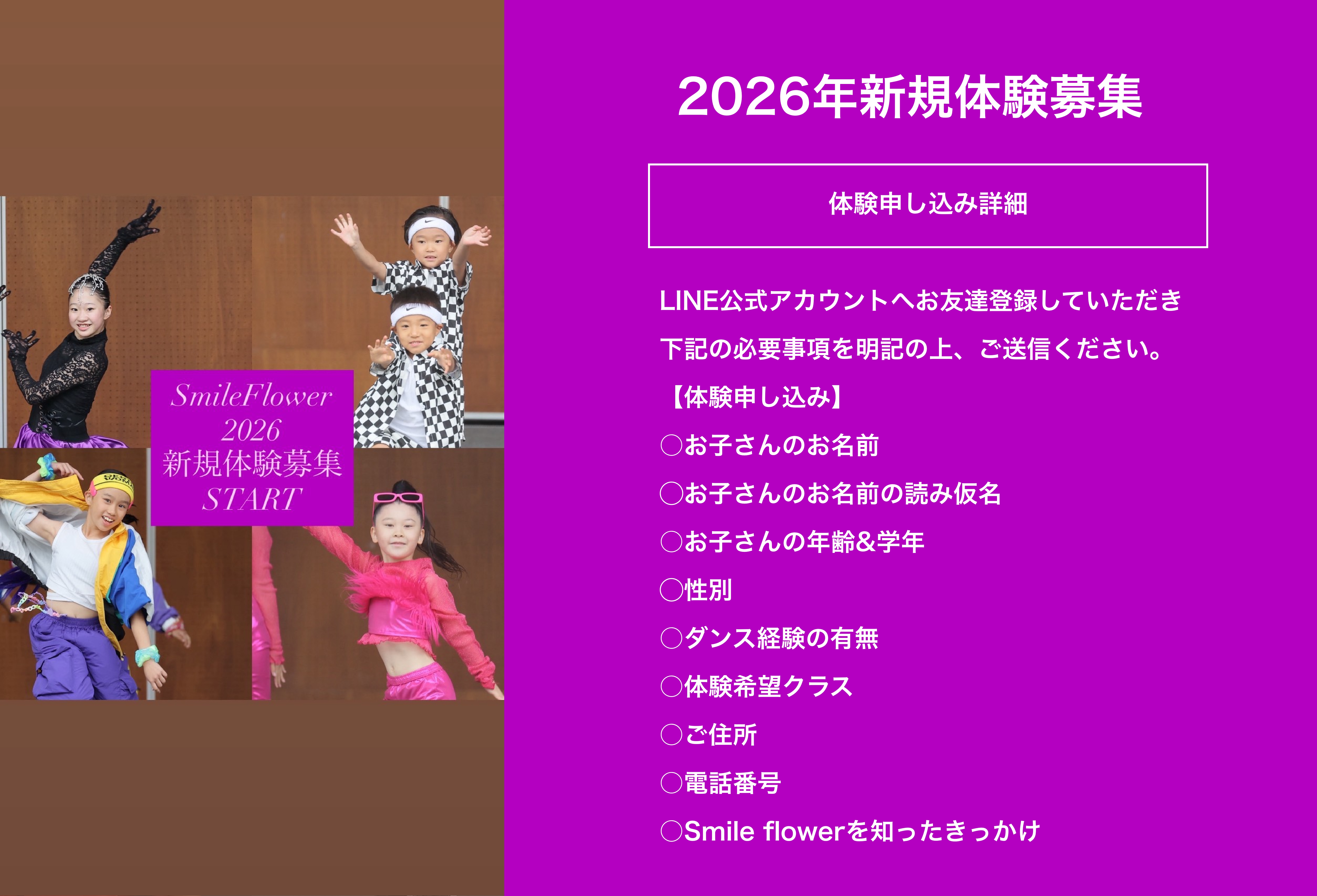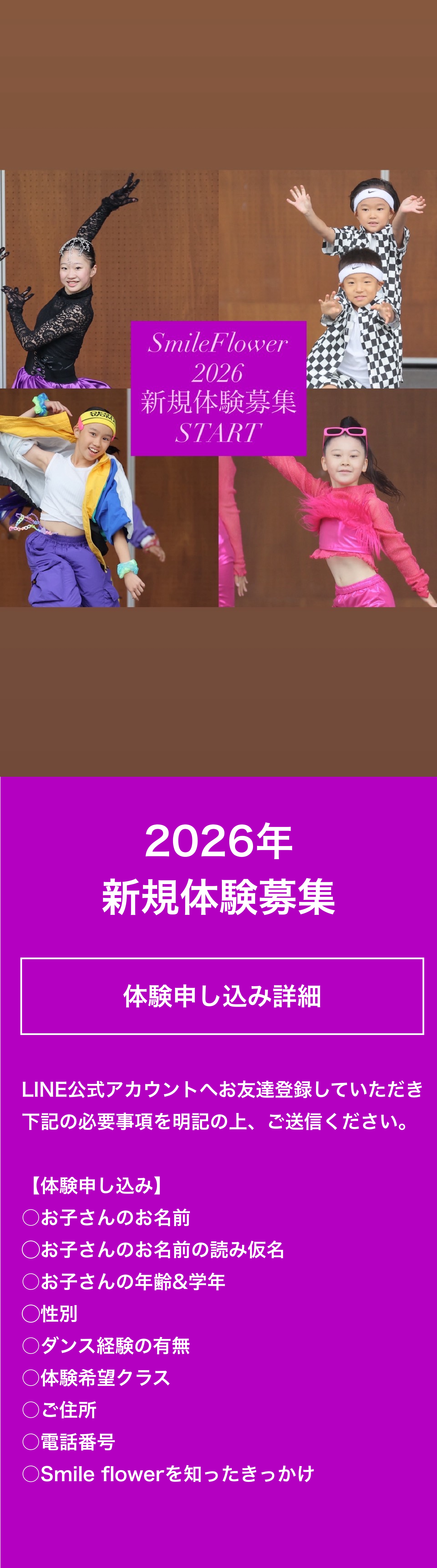 SmileFlower 2026.01.132019.09.25 LINE公式アカウントお友だち登録 NEWS 2025.9.21💐Smile♾️festival💐💐Smile♾️festival💐@apiapiapi1029 @niconico.oyako_smileflower昨年に引き続き2回目の開催になりました❤️🔥❤️🔥まだまだ至らない... 2025.8.31今年も様々なドラマがあったチャレンジカップ全国大会❤️🔥今年も様々なドラマがあったチャレンジカップ全国大会❤️🔥結果がでるものだから、自分が思い描いていたものとは違う部分もあり、いろんな感情だったけど、やっぱり最終こうやって振り返ると、どの子達もめちゃくちゃ輝いてた🥹👏 成長... 2025年5月.6月.7月 JAFスポーツエアロビック2025 茨城オープン、富山オープン、山形オープン、静岡オープンにSmileFlowerから23人が出場してきました🔥JAFスポーツエアロビック2025 茨城オープン、富山オープン、山形オープン、静岡オープンにSmileFlowerから23人が出場してきました🔥このJAF(日本エアロビック連盟)の大会に出場するのは初めてで、エアロビックの... 2025.7.6 善光寺表参道夏祭りに3歳〜中学生までの200名が出演してきました🔥善光寺表参道夏祭りに3歳〜中学生までの200名が出演してきました🔥毎日めちゃくちゃ暑い日が続く中でのイベントだったため、熱中症などを懸念していましたが、誰1人具合悪くなることなくいつも通り元気よく踊り終えることがで... 2025.6.22ファミリーフェスティバルinメセナホール に出演させて頂きました😊@suzakafamilyfestivalファミリーフェスティバルinメセナホール に出演させて頂きました😊@suzakafamilyfestival人数が多いクラスを中心に出演させて頂き、約160名の生徒たちが素敵なステージで伸び伸びと踊っていました❤️... 2025.5.5 スズキジャパンカップ2025 全日本総合エアロビック選手権長野大会2025.5.5 スズキジャパンカップ2025 全日本総合エアロビック選手権長野大会フレッシュライトカップに大会初挑戦メンバーが16名、サーキットクラスが5名、計21名の選手が出場してきました!GW真っ只中のこどもの日にみんな朝からよく ❤️Annie出演情報❤️❤️Annie出演情報❤️2025年丸美屋食品ミュージカル『Annie』のダンスキッズに昨年末までSmileFlowerに10年間在籍していた湯本 莉子(13歳)がオーディションを勝ち抜き出演することになりました👏2歳からクラシックバレエと 2025.3.22 全国こどもチャレンジカップ長野大会2025.3.22 全国こどもチャレンジカップ長野大会SmileFlowerからは21人の生徒が出場しました🔥埼玉から1ヶ月間でしっかり課題に向き合い頑張ってきて、もう後半は疲労の蓄積で足が痛い子も出てきていて、みんなテーピングで補助し 音楽に合わせて楽しく体を動かし、マット、バルーン、ボールなどを使って筋力、 柔軟性といった基礎体力を身につけます。 ステージ発表では表現力・仲間との協調性を養いながら子供の自尊感情を高め「やる気」「自信」を引き出します。 詳しくはこちら ママが思いっきり体を動かしリフレッシュするだけでなく、お子様もイキイキと楽しめる親子が共に笑顔になれるプログラム作りを心がけています 詳しくはこちら smail∞festival 2024.6.9 Smile Flower 5th anniversary